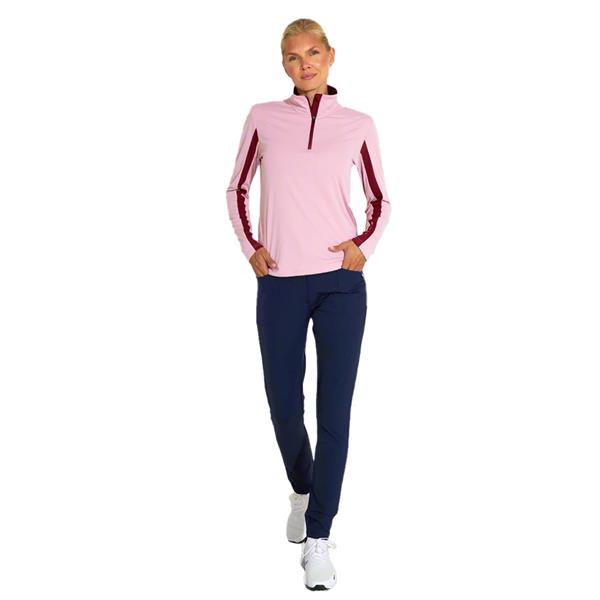 This long-sleeved layer 1 top is made from a thin and stretchy material with built-in UV protection that lasts for the life of the garment. DryCool and breathable features keep you comfortable and stylish throughout the round. It has a polo collar with a half-zip and a sporty contrast stripe in navy along the sleeve and across the back. The back is generous in length to ensure that there is no gap between the top and bottom.