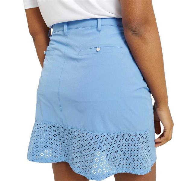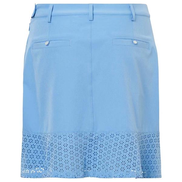 Manga skort is made of a functional fabric that is 4-way stretchable and breathable. The fabric also has drycool and wicking effects. Two front pockets, two back pockets with decorative rhinestone buttons, frill at body bottom in punched flowery pattern. Zipper and waist button in left hand side seam. Loops around waist allows for a belt. Inner shorts in soft jersey. Abacus logo at left hand side pocket. Length of skort is available in regular (17"/45cm) or long (19"/50cm).