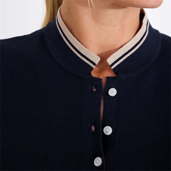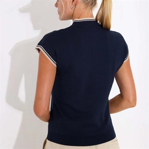 The fine knit offers comfortable stretch and a light, breathable feel. A ribbed stand-up collar and contrast stripe at the sleeve ends give a subtle nod to classic golf knitwear.