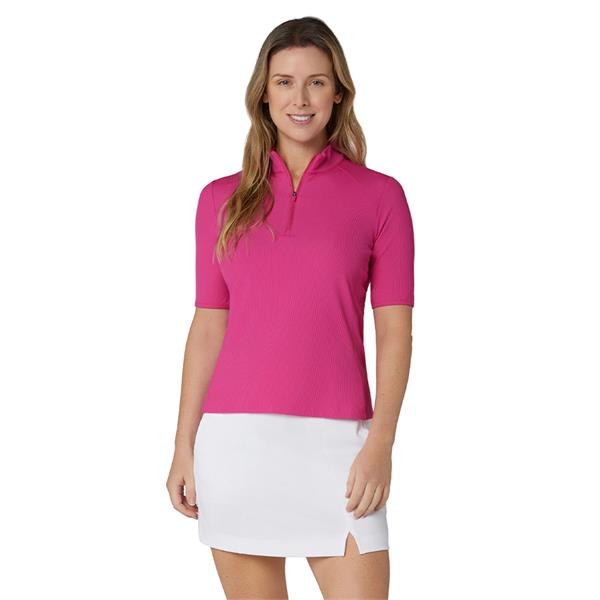Elevate your golf wardrobe with the Callaway Apparel women's Rib Play golf polo, a versatile shirt designed for both style and performance. Its chic mock neck collar and practical short sleeves provide a polished athletic aesthetic, while the intricate rib play detail creates a sophisticated garment suitable for any golfing endeavor.
