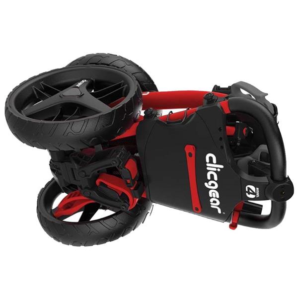 The Clicgear Model 4.0 is the latest update of our very successful three wheel golf pushcart design. We have added several improvements to the original design to make this the best model ever. These include New console lock, adjustable upper saddle, silicone straps, adjustable front wheel, umbrella tube strap, improved scorecard & pencil holder.