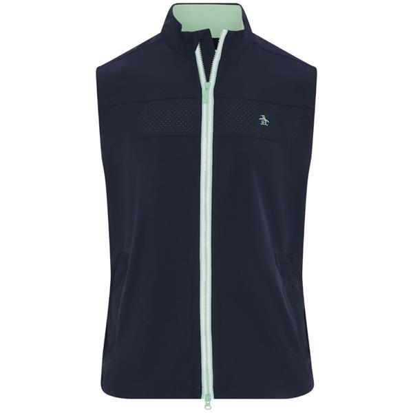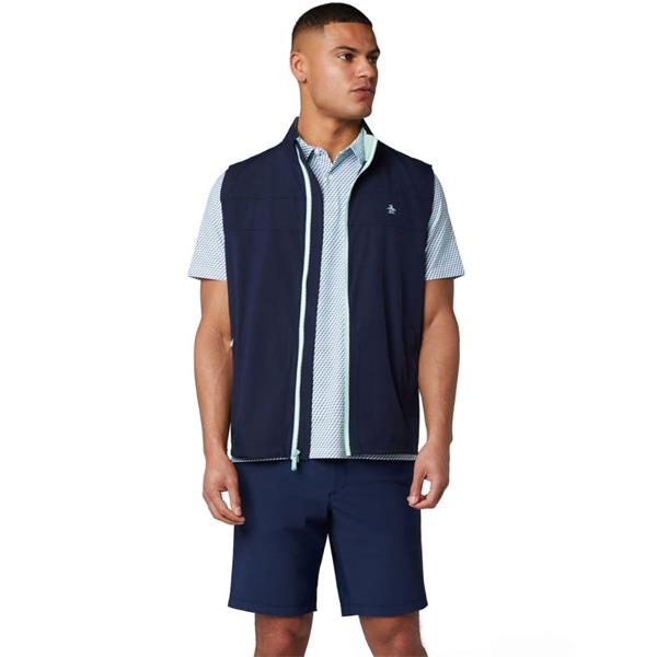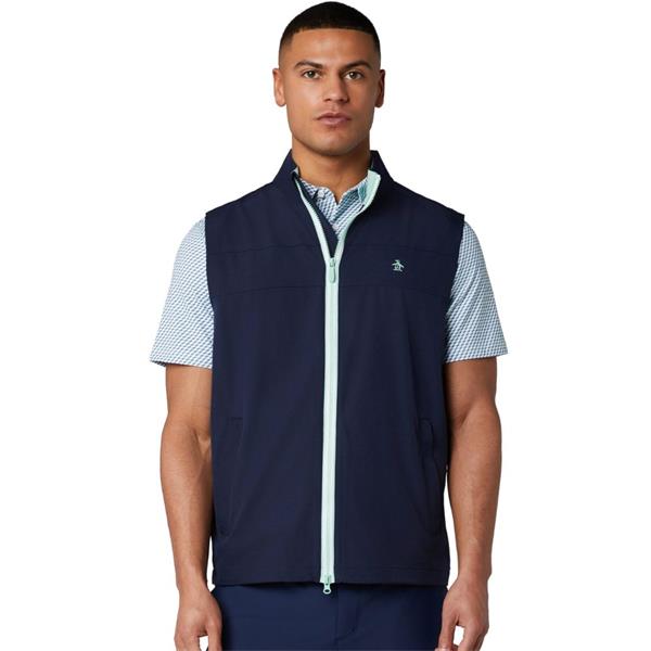 Be ready for any weather conditions with this Original Penguin men's golf vest made with the game in mind. Plain weave fabrication delivers enhanced durability, while a packable design provides on-the-go convenience. Added stretch ensures a comfortable fit with flex. With water repellent fabric to keep you dry, this golf vest also offers lightweight warmth for cooler days.