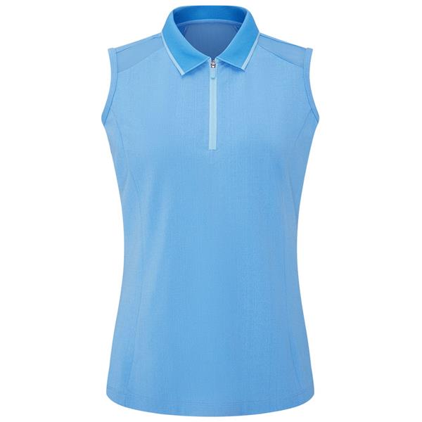 Bring a touch of modern luxury to your game with the Eben Ladies Sleeveless Polo in Infinity Blue. Engineered from soft pique fabric, it combines sheer shoulder and back yoke panels for a light, feminine feel. The zip-neck closure offers adaptable styling, while the textured collar with contrast tipping delivers a polished finish. Complete with the PING logo at the back, this polo is designed for confidence and comfort. Style with slim-fit trousers or performance shorts for a sleek, athletic look.