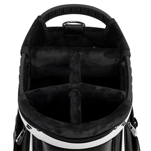 With its 9.5 top dividing into the traditional and popular 5-way sections and so making organising your clubs easier. Each of the sections are wrapping to protect your club shafts and reduce the amount knocking together and bag chatter. A total 8 conveniently placed pockets provide plenty of space for your on-course needs but an ergonomic rubber foot base is stable and balanced. The Srixon tour staff golf bag is a superb choice for serious golfers who want a stylish, sturdy and reliable home for all their golf essentials. At 5.6kg it’s designed to travel in the golf cart, but still having the capacity to standing upright when placed on the floor.
